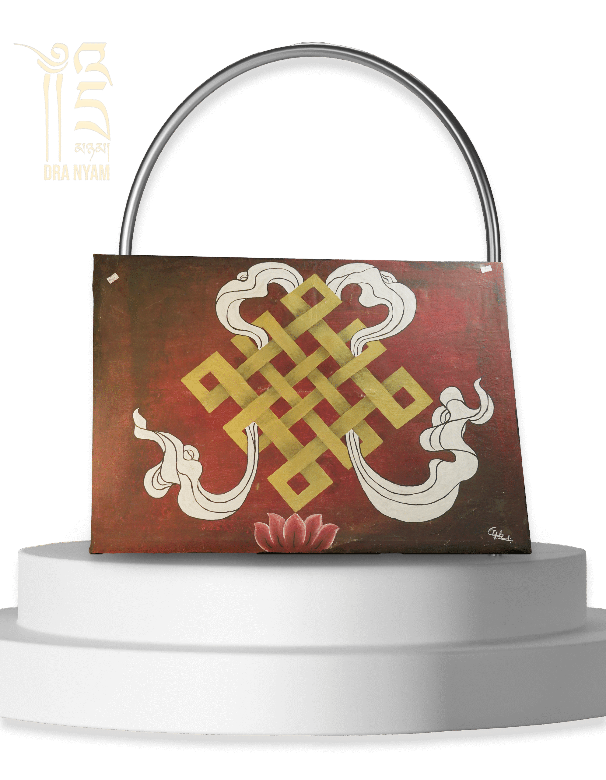 Set against a deep earthy red background, the gold knot is surrounded by flowing white cloud motifs and anchored by a soft lotus base. Each element is locally inspired and painted by skilled Bhutanese hands.
